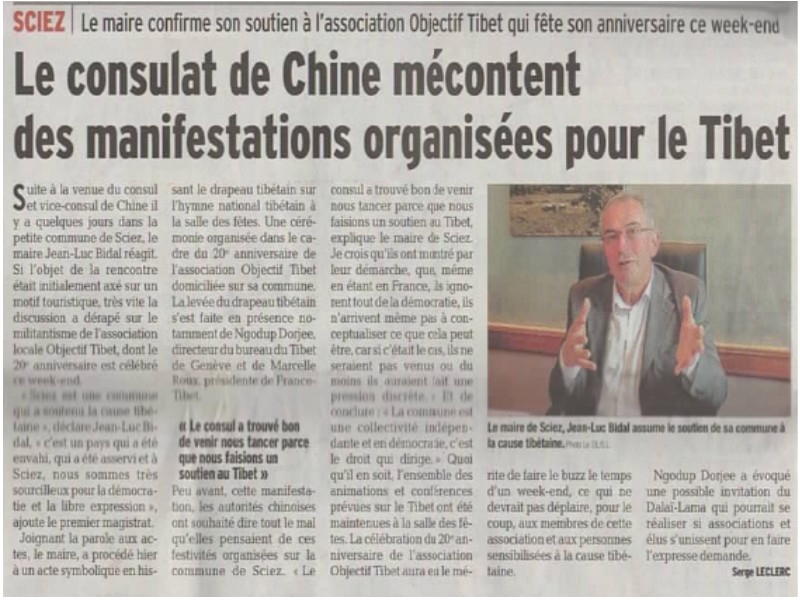 Dans son allocution, le maire de Sciez, M. Jean-Luc Bidal, a déclaré: ‘’Je ne suis pas homme à courber l’échine; je suis attaché aux libertés, aucune n’est respectée là-bas et, en plus, on vient me menacer? Pour moi, cela veut dire que j’ai doublement raison de soutenir le peuple tibétain et son ‘’juste’’ combat; le Tibet, c’est un pays qui a été envahi, qui a été asservi et, à Sciez, nous sommes très sourcilleux pour la démocratie et la libre expression”.